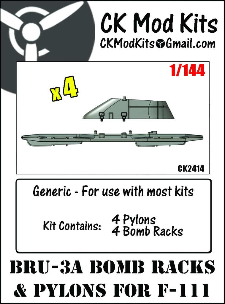 BRU-3A Bomb Racks and Pylons for the F-111 Scale: 1/144Item #: CK2414Released: 2024MSRP: $5.00 Designed For:Universal / Generic