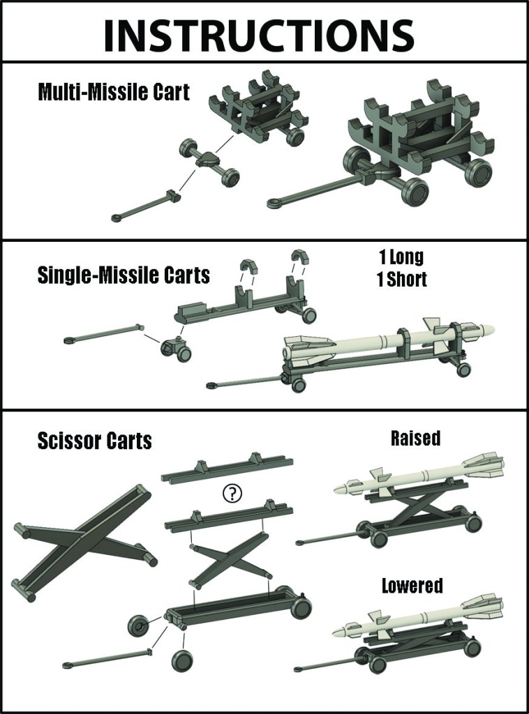 These carts are designed to be used with a variety of weapons from different kits. Each cart comes in multiple pieces so you can adjust the placement and angle of wheels, etc. Instructions below: