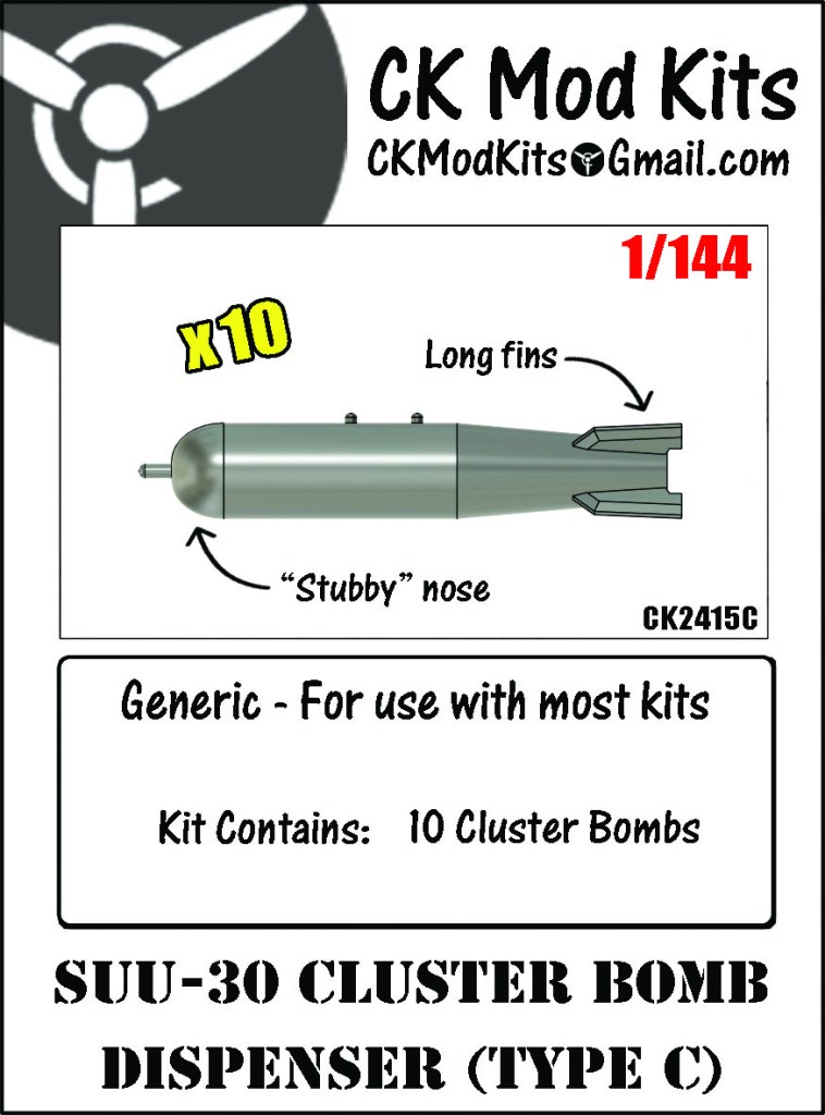 These are designed to be used with our BRU-3A bomb racks and pylons. Additional styles of cluster bomb are available as CK2415A and CK2415B.